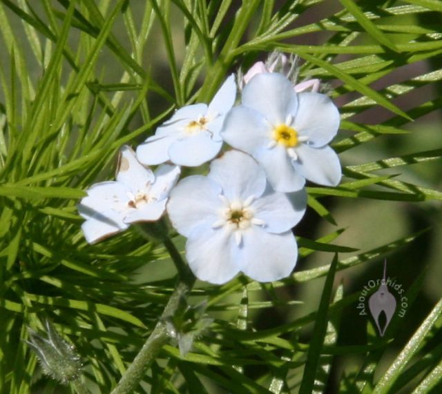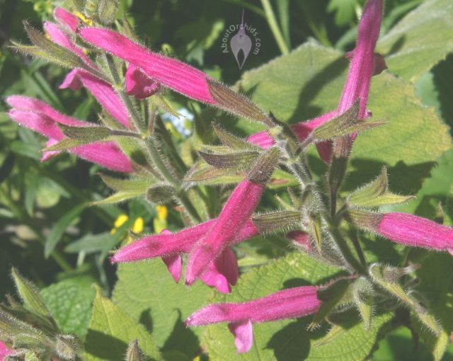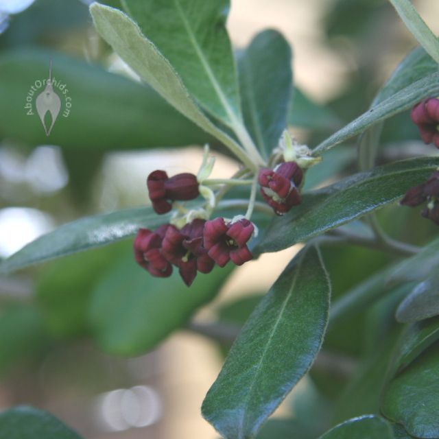 As for non-orchid blooms, this Sage offers a multi-sensory experience — soft, furry, pineapple-scented leaves and fuzzy, hot-pink flowers. It grows more than 5 ft tall (1.5 m) and puts on a big spring show with dozens of blooms. Little blue Forget-me-not’s return every year to the garden. The tiny flowers are great, but the seeds that follow are encased in small burrs that stubbornly attach to clothing. The small, dark red flowers belong to Pittosporum trees that line our back fence.