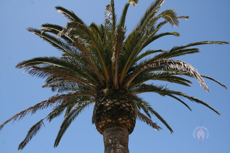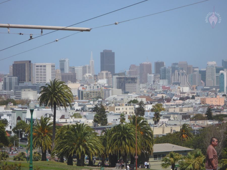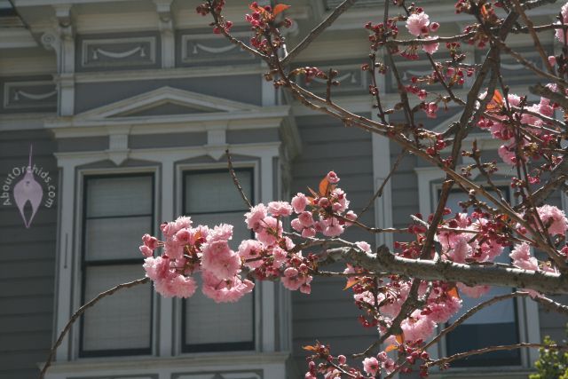 Dave and I took advantage of a nice spring day to enjoy nearby Mission Dolores Park, a green island between the Mission and Castro neighborhoods. We didn’t find any orchids, but there was so much in bloom that we barely noticed. These delightful cherry blossoms had us pulling out our cameras before we even got to the park. Along the way we also looked up at a majestic Canary Island Date Palm, which can grow taller than 60 ft. (18 m.) This one was a baby by comparison at about 40 ft. (12 m.)