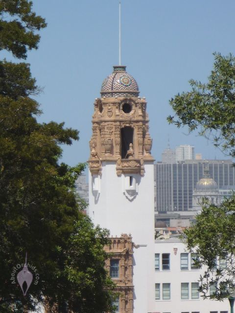 The gorgeous orange flower below looks like a type of daisy. It was partially hidden by the dense growth around it, easily missed by those rushing by. Next, there’s a park view of nearby Mission High School. The building in the distance on the right with a gilded dome is San Francisco City Hall. Finally, a view of downtown from the park shows overhead trolley wires in the foreground, and the famous Transamerica Pyramid in the distance.