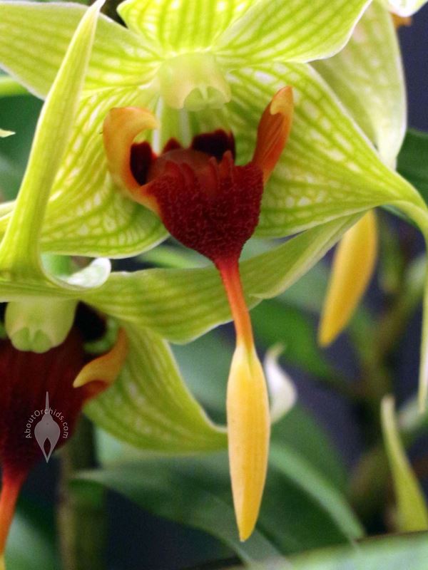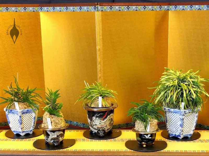Dendrobium tobaense var. giganteum, orchid species flower with bizarre flower lip, close up of flower lip, Pacific Orchid Expo 2018, SF County Fair Building, Golden Gate Park, San Francisco, CaliforniaVanda falcata orchids displayed in traditional Japanese flowerpots, Neofinetia falcata, Samurai Orchid, miniature orchids, variegated leaves, Pacific Orchid Expo 2018, SF County Fair Building, Golden Gate Park, San Francisco, CaliforniaDendrobium cuthbertsonii, orchid species flowers with moss, miniature orchids, Pacific Orchid Expo 2018, SF County Fair Building, Golden Gate Park, San Francisco, California