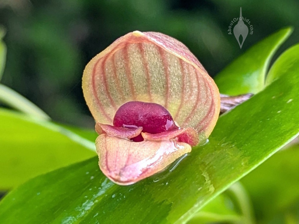 The photos below show the Clam Shell Orchid, Pleurothallis palliolata, native to Costa Rica and Panama. I’ve had it for ages, and it’s a very reliable bloomer. The unusual blossoms emerge from the tops of the leaves, and look like clams sticking out their tongues.