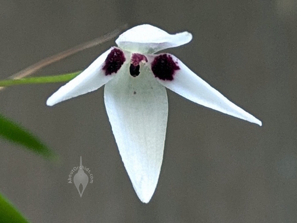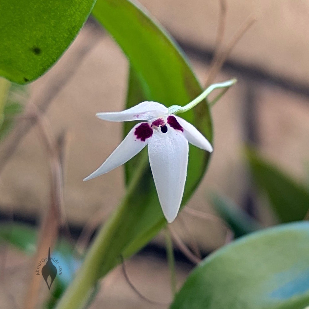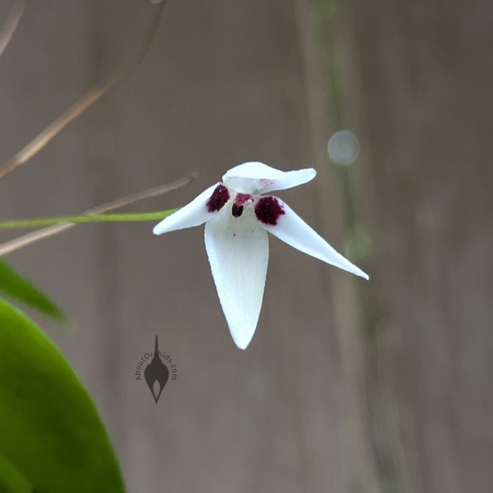 Pleurothallis orchids don’t have the largest or most colorful flowers, but they can be fascinating. These two species exemplify their charms. In the photos above, the first is Pleurothallis viduata, a miniature from Ecuador. I bought it at Orchids in the Park this past July. Its white and purple flowers bob in the breeze on thin, wiry stems, resembling little white birds in flight. So far, it’s stayed in bloom for over two months.