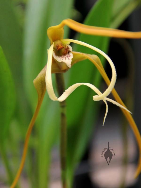 Tulip Orchids need high humidity, good air movement, regular water, and regular fertilizer. Give them morning sun, and take care that their leaves don’t burn on hot days. During winter dormancy, older leaves drop off. Cut back watering until they put out new growth. There are more yellow, red, and white varieties, but I don’t have pictures of those (yet!) except for the bright yellow Angulocaste flower in the final photo. These orchids are also called Cradle Orchids, and in Spanish, Cuna de Venus, or “Cradle of Venus.”