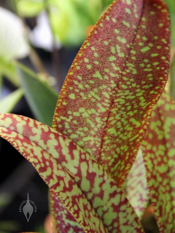 Next, the twisted petals of this Maxillaria species seem to dance in embrace. Competing for attention, an unusual Oncidium sports red and green mosaic leaf patterns. Meanwhile, long chains of tiny Dendrochilum blooms dangle like holiday decorations.
